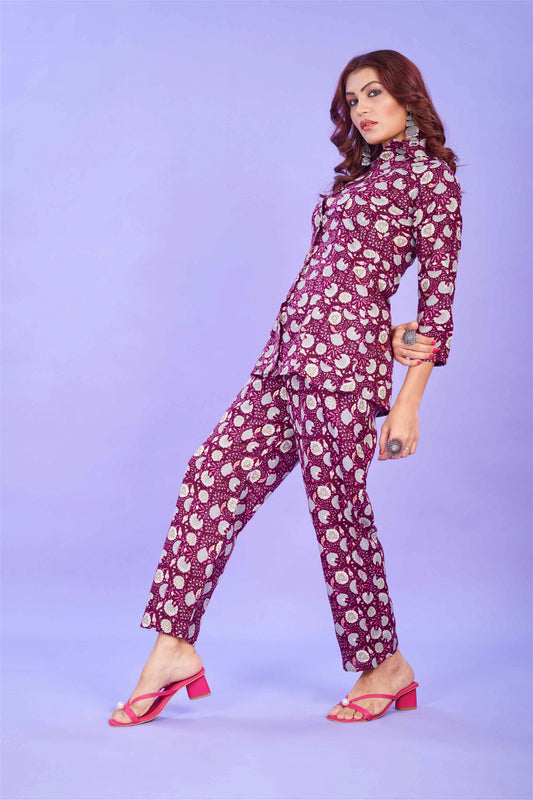 Wine Colour Cotton Printed Party Wear Co-ords Set