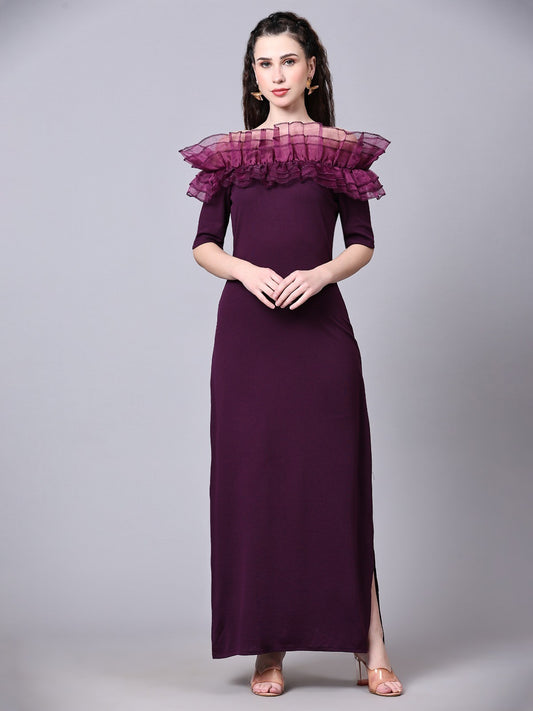 Wine Designer Cotton Lycra Off Shoulder Women's Regular Fit Dress