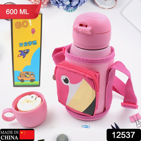 Love Baby Cute Animals Prints Kids Bottle Sipper for HOT N Cold Water, Milk, Juice with Bottle Cover, Cup, Zip Pocket & Straw to Keep Things Orange Green Pink Colors for Outdoor / Office / Gym / School (600 ML)