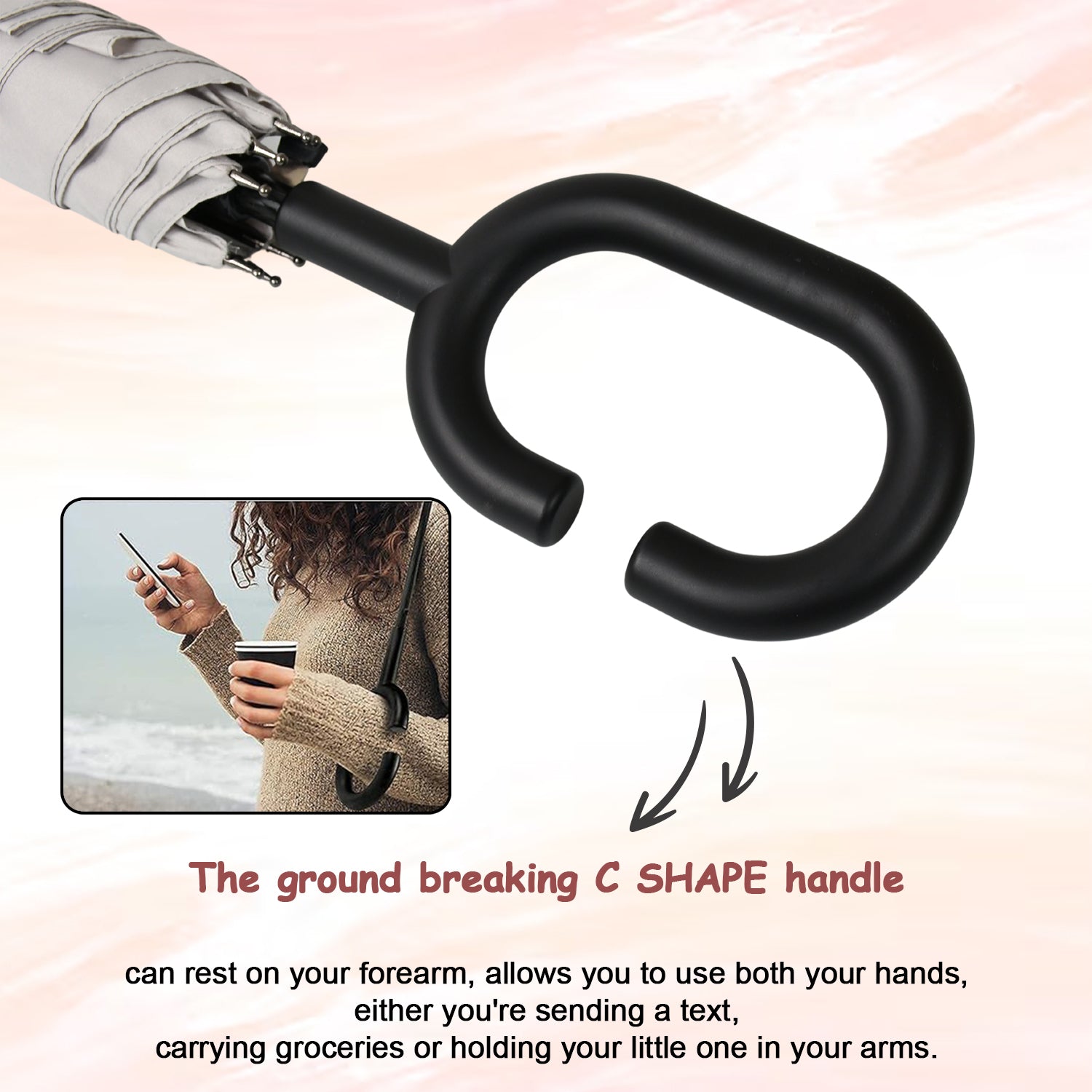 - ERGONOMIC C-SHAPED HANDLE - Walk comfortably hands-free while answering your phone calls, handle grocery bags, baby, or even grab your kid?s hand. The comfort grip C-Shaped handle allows you to slide over your forearm or wrist so you can attend to what is more important.