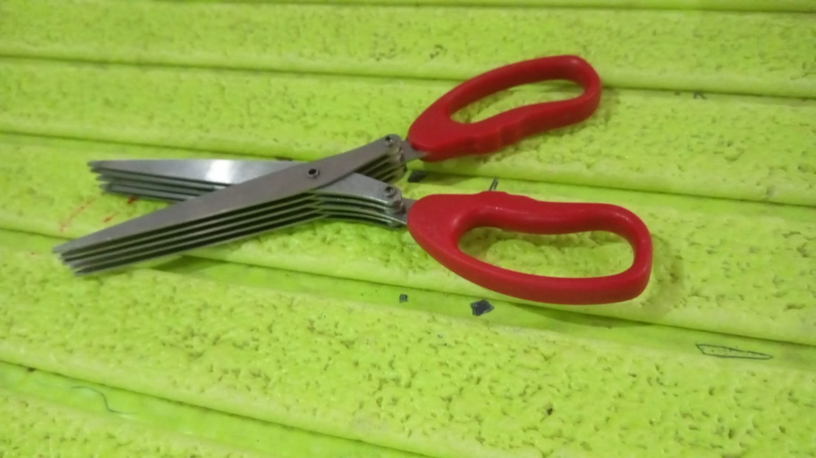 - Stainless blade and plastic handle, used in kitchen for cutting leafy vegetables.