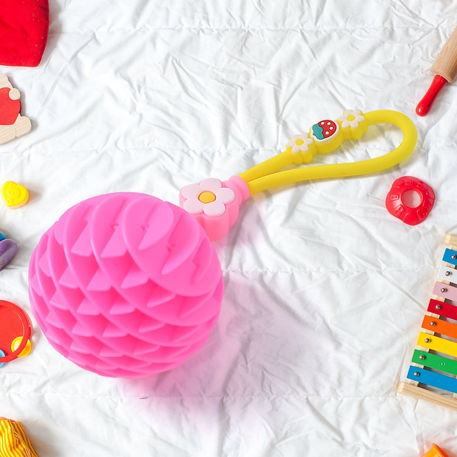 Attached with a kid-friendly elastic strap featuring adorable flower accents for easy hanging on bags, pencil cases, or keychains.