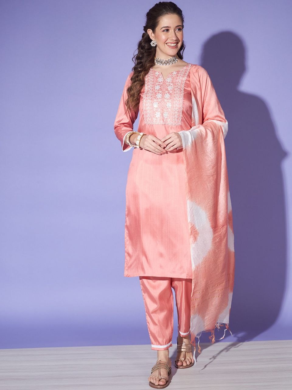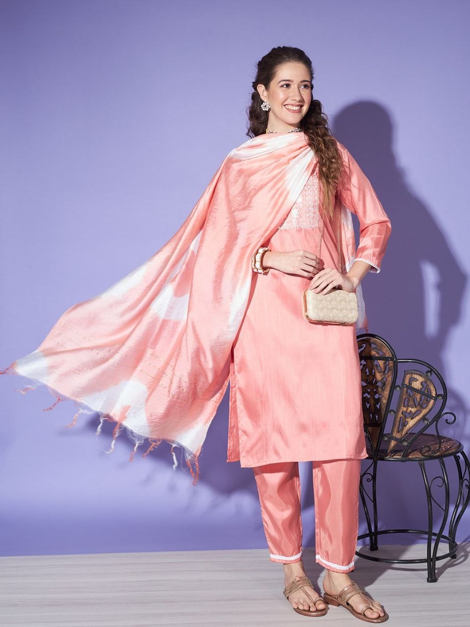 Women's Peach Colour South Silk Kurta Pant With Dupatta Set